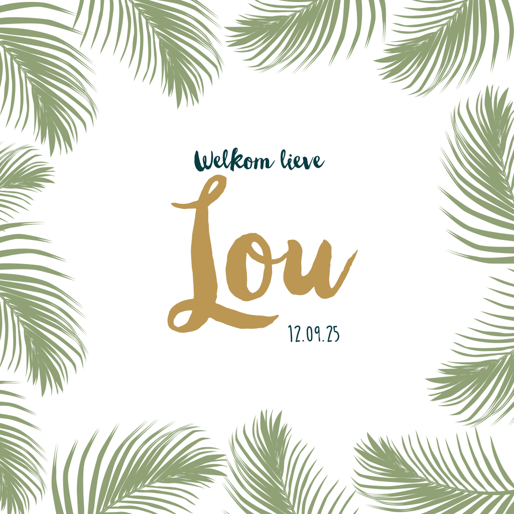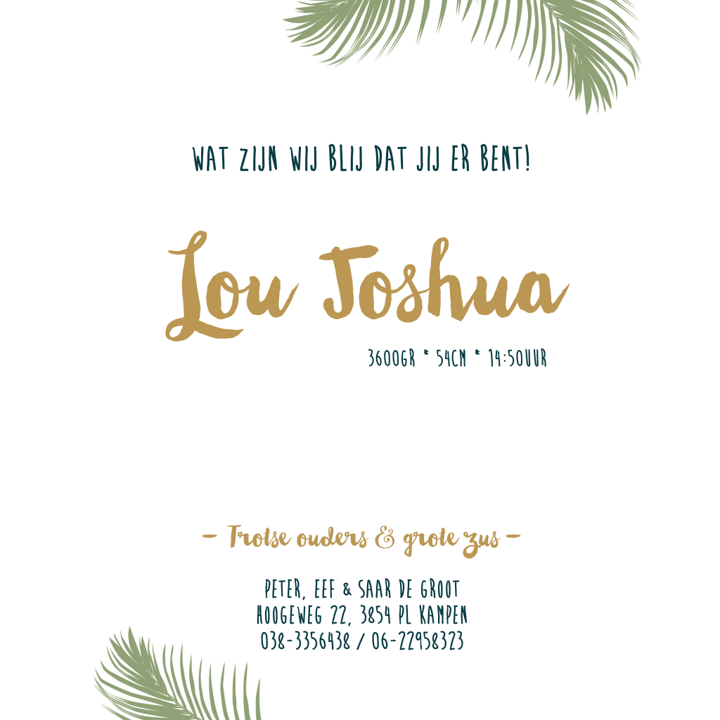 Een stoer, botanisch geboortekaartje voor een jongen. Tekstkleuren en lettertypes kun je in de online editor aanpassen. Liever een andere achtergrondskleur? Ook dat is mogelijk. Kijk wat er allemaal mogelijk is in onze online editor en maak het kaartje helemaal naar wens.