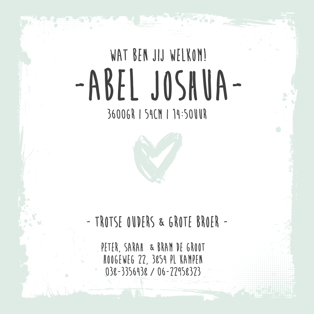 Stoer en lief geboortekaartje met watercolour achtergrond met een stoere rand en geschilderd hartje. Het geboortekaartje is geheel aan te passen in editor.