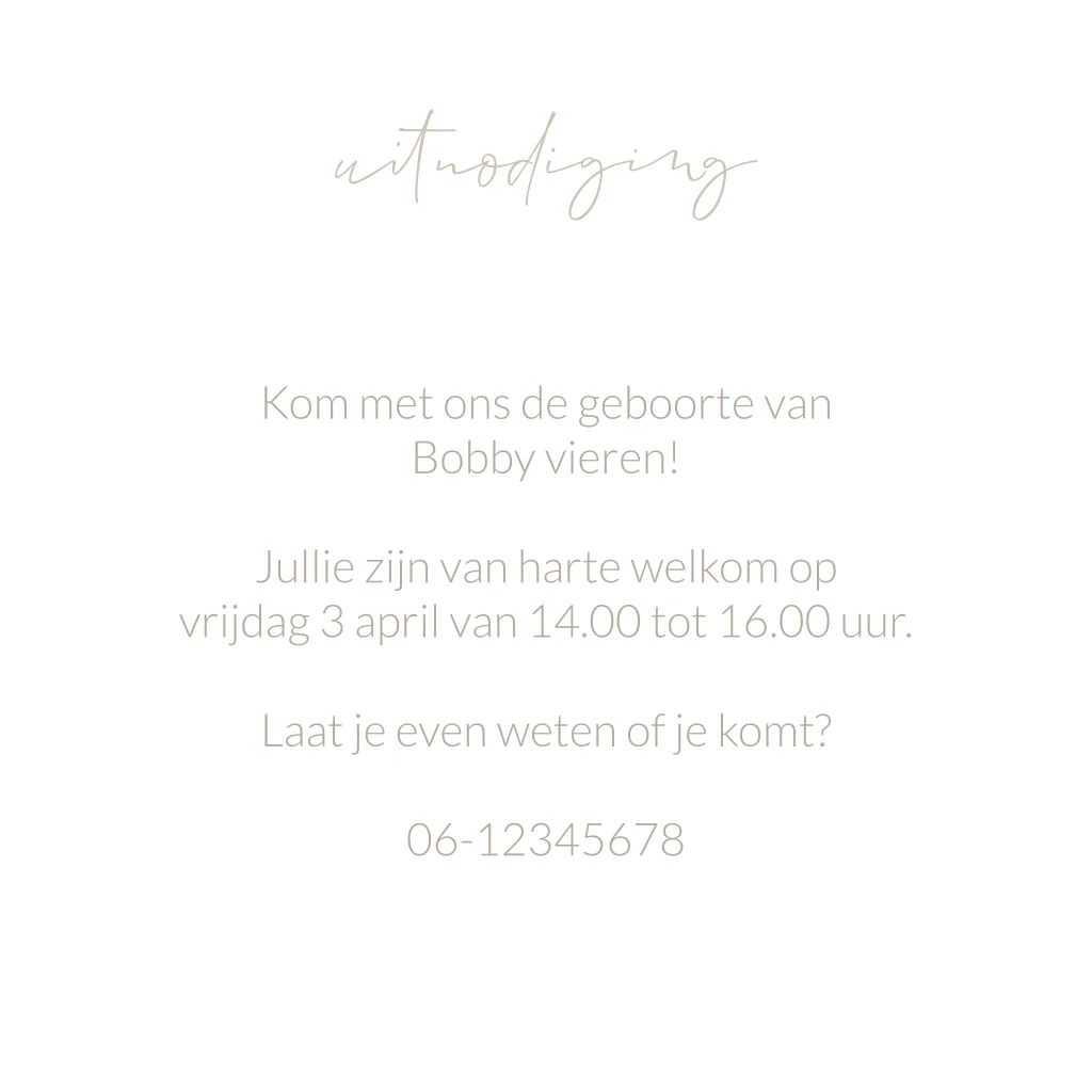 Nodig familie en vrienden uit voor de babyborrel na de geboorte van jullie kindje met deze neutrale witte kaart. De tekst is in dezelfde beige kleur als het geboortekaartje met goudfoliedruk gecombineerd, voor een extra luxe effect!