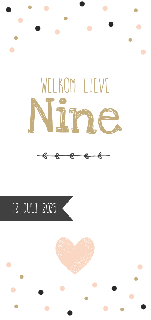 Lief geboortekaartje dochter met confetti in roze, grijs en goudlook, een stoere banner en hartjes. Pas dit geboortekaartje aan naar wens.