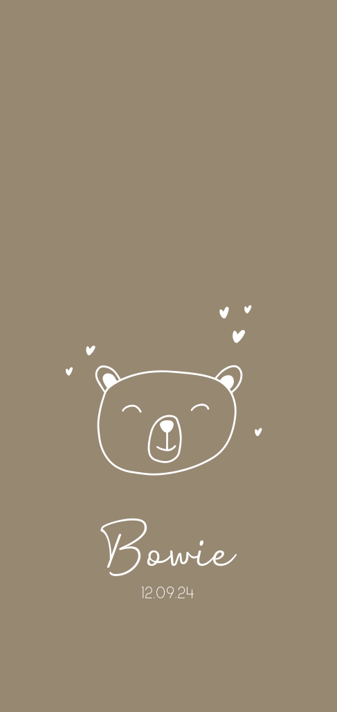 Een lief neutraal geboortekaartje met een beren hoofdje en hartjes in foliedruk. Het kaartje heeft een bruine achtergrond en is volledig te personaliseren in onze online editor.