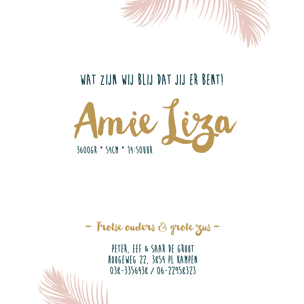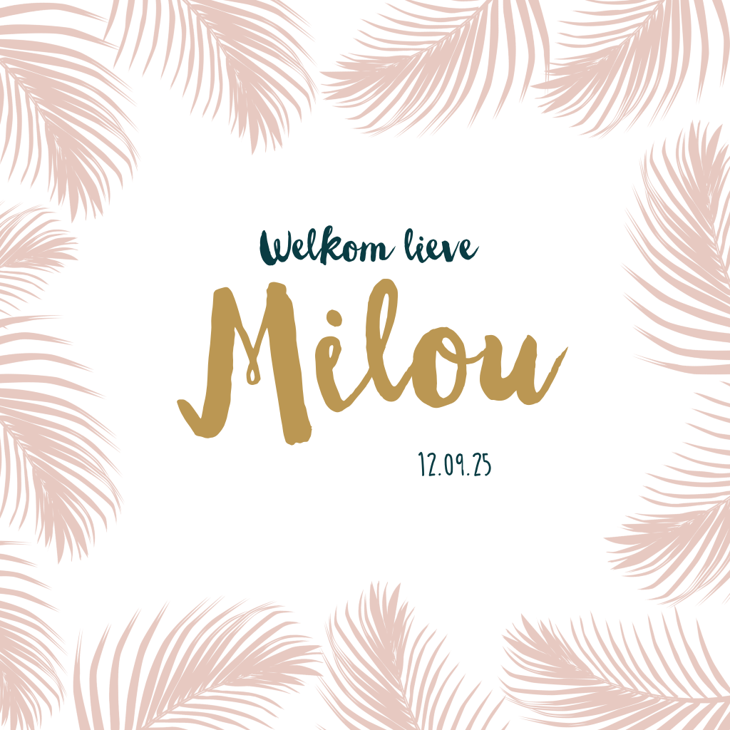 Hip botanisch geboortekaartje met oudroze varentakken. De okergele en blauwe letters geven de kaart een stoere uitstraling. Het kaartje kun je helemaal naar wens aanpassen. Zo kun je bijvoorbeeld kiezen voor andere lettertypes of andere kleuren. Maak er helemaal jouw kaartje van!