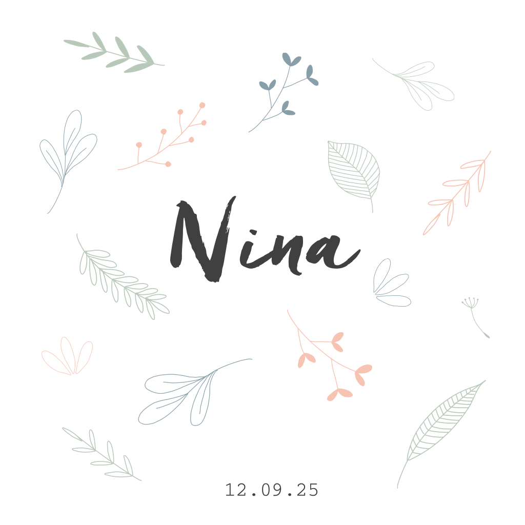 Lief en zacht geboortekaartje voor een klein meisje met allemaal getekende takjes met blaadjes en bloemen in verschillende kleuren.