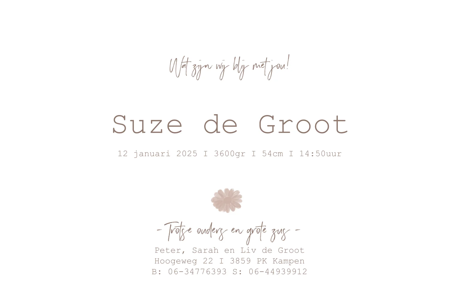 Lief geboortekaartje voor je pasgeboren dochter met een schattig patroon van geschilderde madeliefjes. Plaats aan de binnenkant van de kaart een mooie foto van jullie kindje om het geboortekaartje helemaal af te maken! De voorbeeld foto aan de binnenkant is van shirleyfayfotografie.nl.