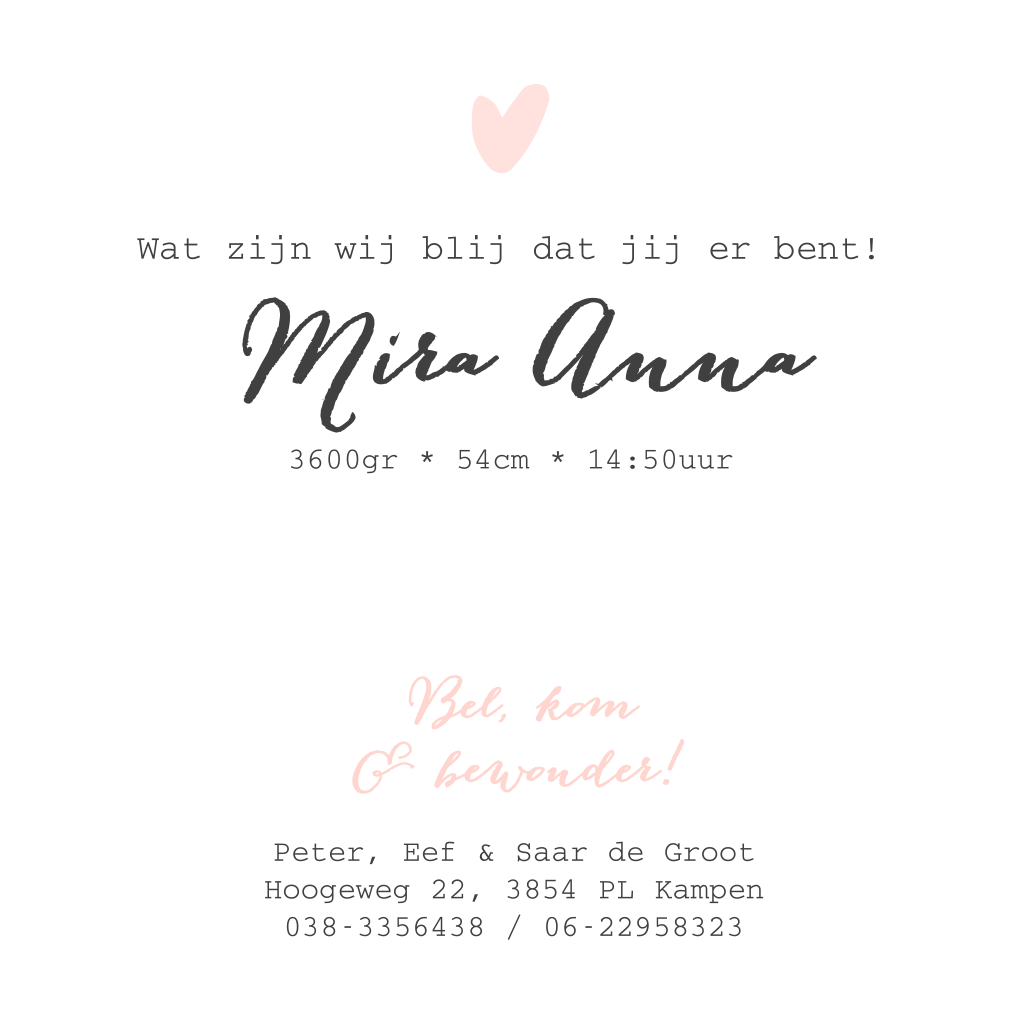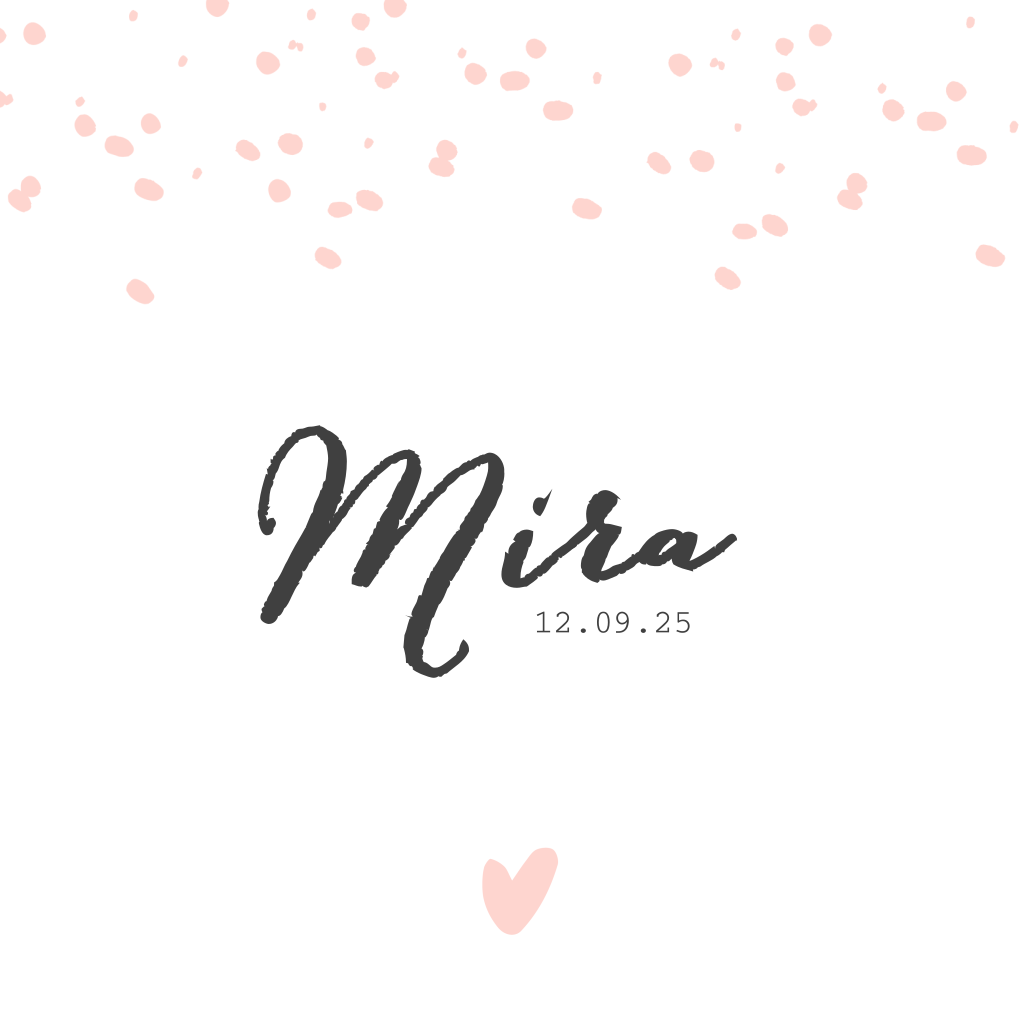 Eenvoudig en lief geboortekaartje voor een meisje met zacht roze stippen en een hartje. Alles is nog helemaal aan te passen in onze online editor, zodat het kaartje helemaal wordt zoals jij graag wilt!