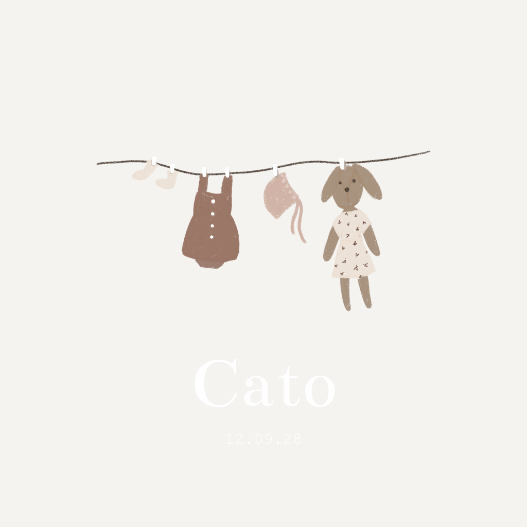 Wat een schattig kaartje voor een meisje. Het kaartje heeft lieve illustraties van een waslijn vol met kleertjes en een knuffel voor jouw meisje. De naam is gedrukt in goudfolie en komt prachtig naar voren. Bestel een proefdruk om dit kaartje in het echt te bewonderen.