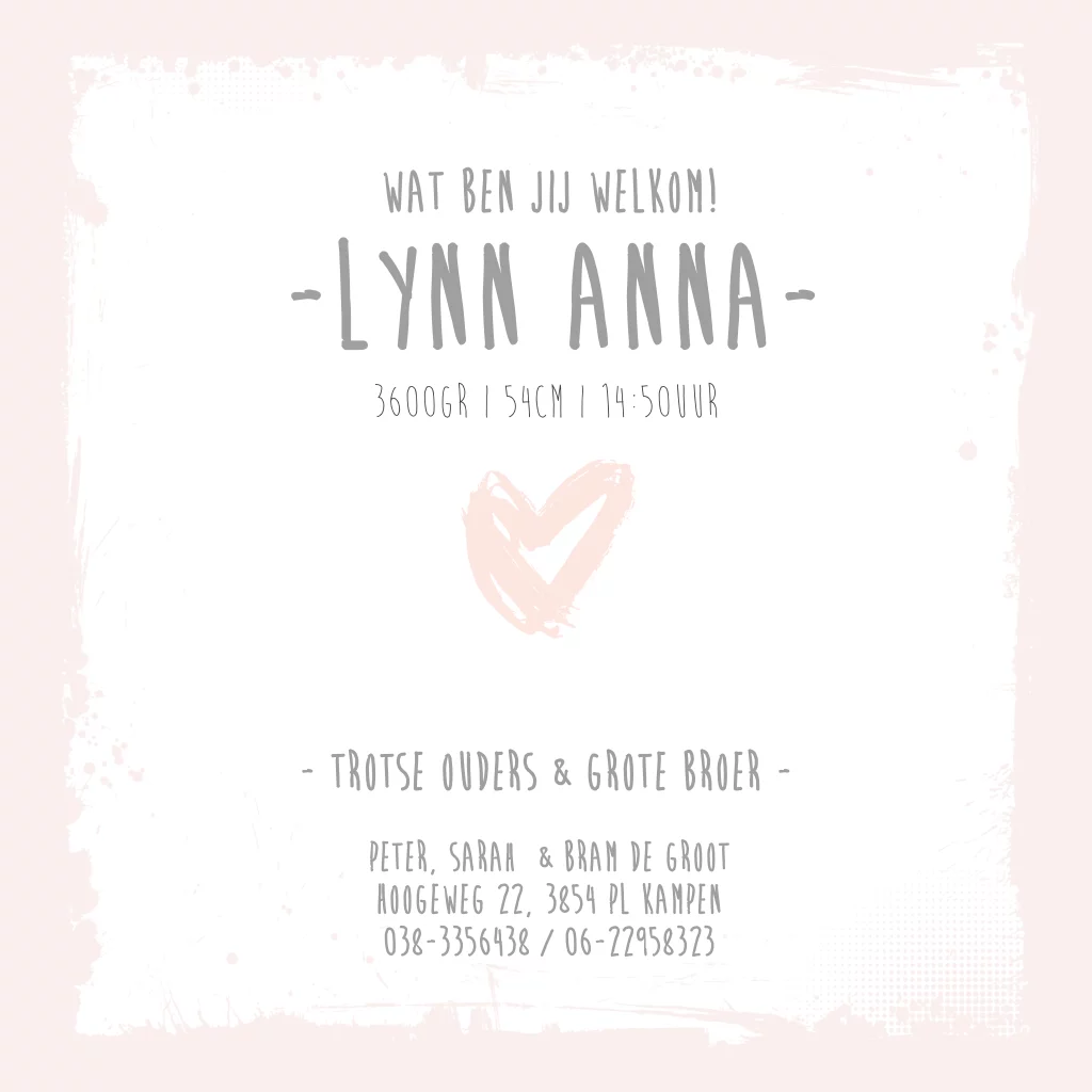Lief geboortekaartje dochter met stoere rand en een roze watercolor achtergrond. Dit eenvoudige, maar lieve geboortekaartje is geheel aan te passen in editor.