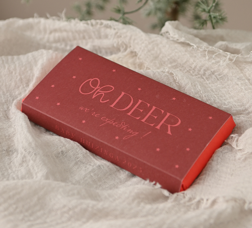 Maak de zwangerschap deze kerst op een unieke manier bekend met deze wikkel voor een chocoladereep! De wikkel heeft een rode achtergrond met sterretjes roze elementen. Pas de wikkel helemaal naar wens aan in onze online editor.