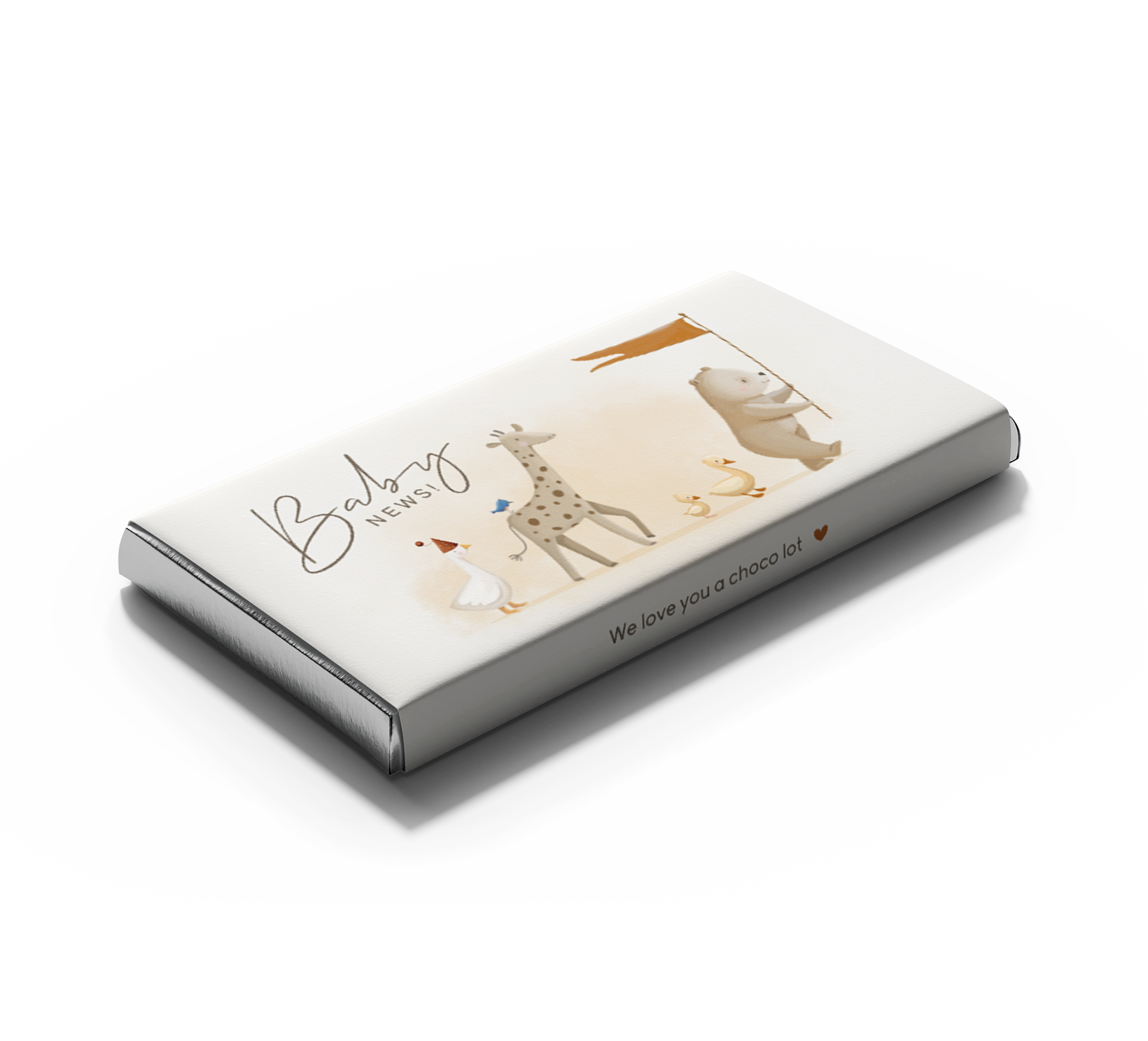 Kondig jullie zwangerschap op een bijzondere manier aan met deze wikkel voor een chocoladereep. De wikkel heeft een witte achtergrond met daarop de tekst "Baby news!" en de illustraties van een gans, giraffe, vogel, eendjes en een beer. De wikkel kan helemaal aangepast worden in onze online editor.