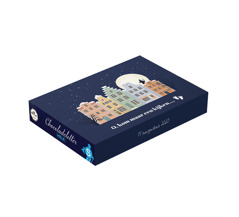 Dit is een originele manier om de zwangerschap aan te kondigen. Deze wikkel voor een Droste chocoladeletter heeft een donkerblauwe achtergrond met de illustratie van kleurrijke huisjes. Op het dak van één van de huisjes is het silhouet van sinterklaas te zien. De wikkel is helemaal naar wens aan te passen in onze online editor.