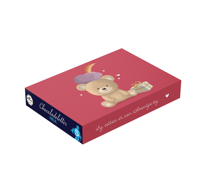 Dit is een originele manier om de zwangerschap aan te kondigen. Deze wikkel voor een Droste chocoladeletterheeft een rode achtergrond met de illustratie van een zittende beer met pietenmuts. De wikkel is helemaal naar wens aan te passen in onze online editor.