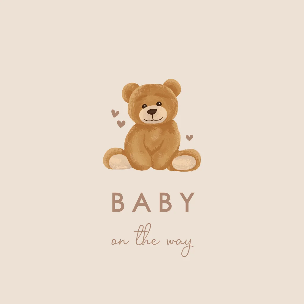 Een lieve kaart om jullie zwangerschap aan te kondigen. Het kaartje heeft zachte ronde hoeken en een beige achtergrond. Op de voorgrond zie je een teddybeertje omringd door hartjes. Onder het beertje lees je de tekst 'baby on the way'. Personaliseer het kaartje in onze online editor en maak jullie aankondiging extra persoonlijk.