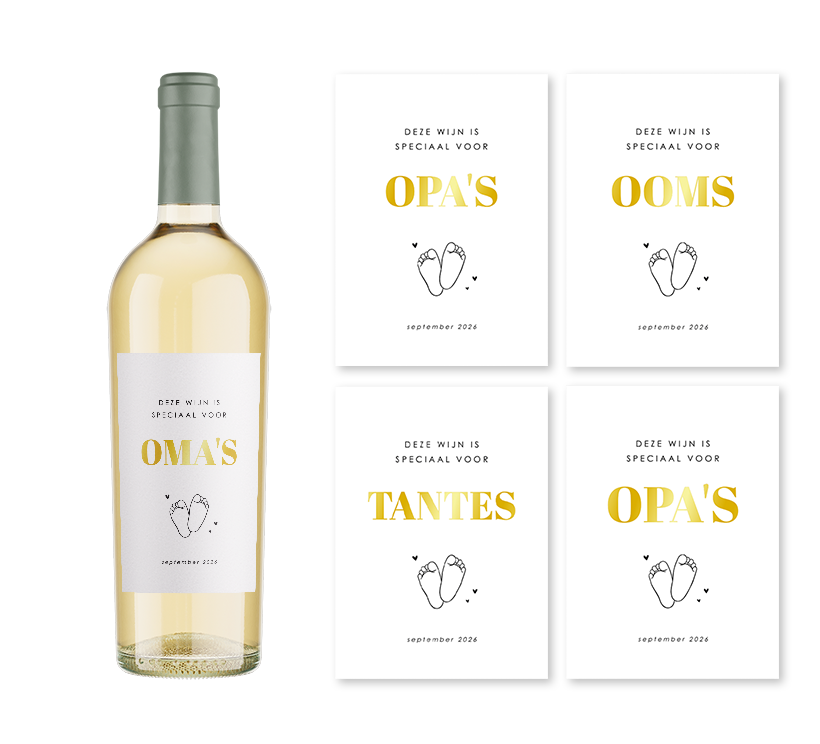 Kondig de zwangerschap op een originele manier aan met deze vijf stijlvolle wijnetiketten. De etiketten hebben een witte achtergrond met goudfolie opdruk en de illustratie van voetjes. De etiketten kunnen afzonderlijk van elkaar bewerkt worden in onze online editor.