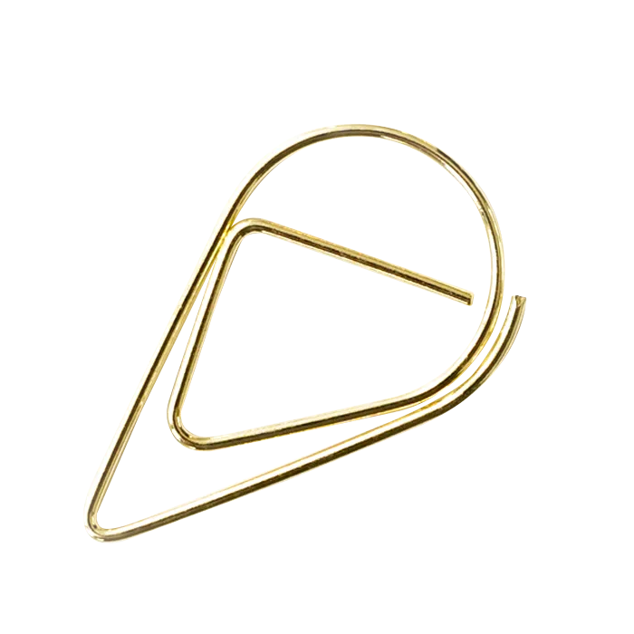 Hippe goudkleurige paperclip in de vorm van een druppel. Afmetingen: 2,5 x 1,5 cm. Verkrijgbaar in zakjes van 25 stuks.