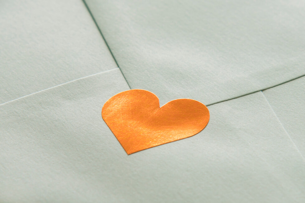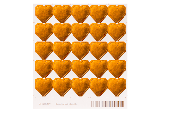 Lieve sluitzegel met hartje van koperfolie. Het koperen hartje staat leuk bij onze hippe koperfolie-geboortekaartjes..